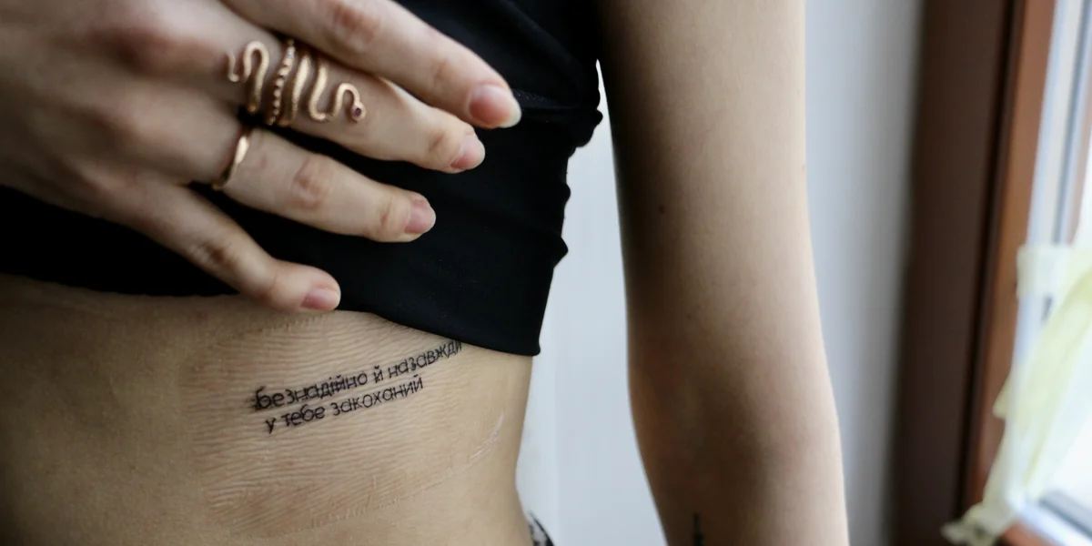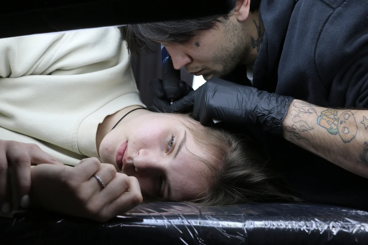 Sofiia arbeitete an der Theke in einer Bar, die jetzt Molotowcocktails herstellt. Statt Bier auszuschenken, kümmert sie sich um die Kinder von Flüchtenden oder sortiert Hilfsgüter. Manche ihrer Freunde finden, jetzt sei nicht der richtige Zeitpunkt für neuen Körperschmuck. Aber für Sofiia geht es um viel mehr als das. „Ich will mich für immer daran erinnern, was unserem Land gerade angetan wird.“