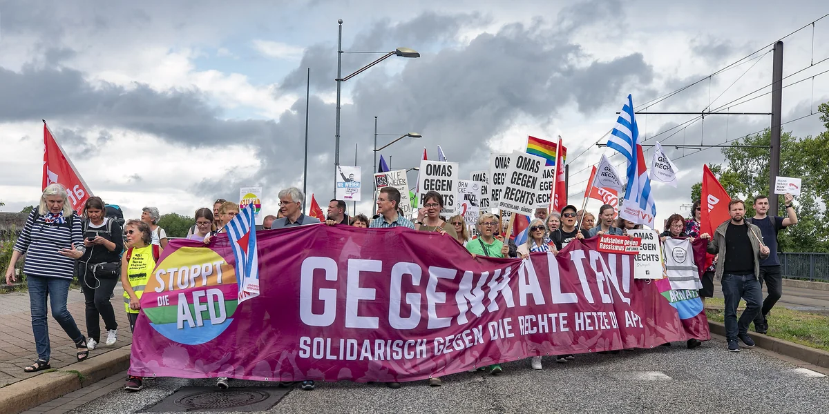 Bereits zwei Stunden vor Beginn der Proteste gegen den Bundesparteitag der AfD sind 13 Polizeiwagen vor dem Magdeburger Hauptbahnhof zu sehen. Es nieselt ein wenig, einige Menschen sitzen in einer Bäckerei gegenüber vom Bahnhof, um nicht nass zu werden. „Entschuldigung, was steht denn da auf Ihrem Banner?“ fragt eine ältere Frau eine andere am Nebentisch. „Omas gegen rechts“ antwortet diese stolz. „Na, das finden wir ja super“, antwortet Erstere und zeigt auf ihre noch deutlich ältere Begleitung. „Sie hat das ja noch alles miterlebt damals. Rechte, die mögen wir nicht“, sagt sie etwas lauter in das Ohr ihrer Nachbarin. Die alte Dame nickt zustimmend.