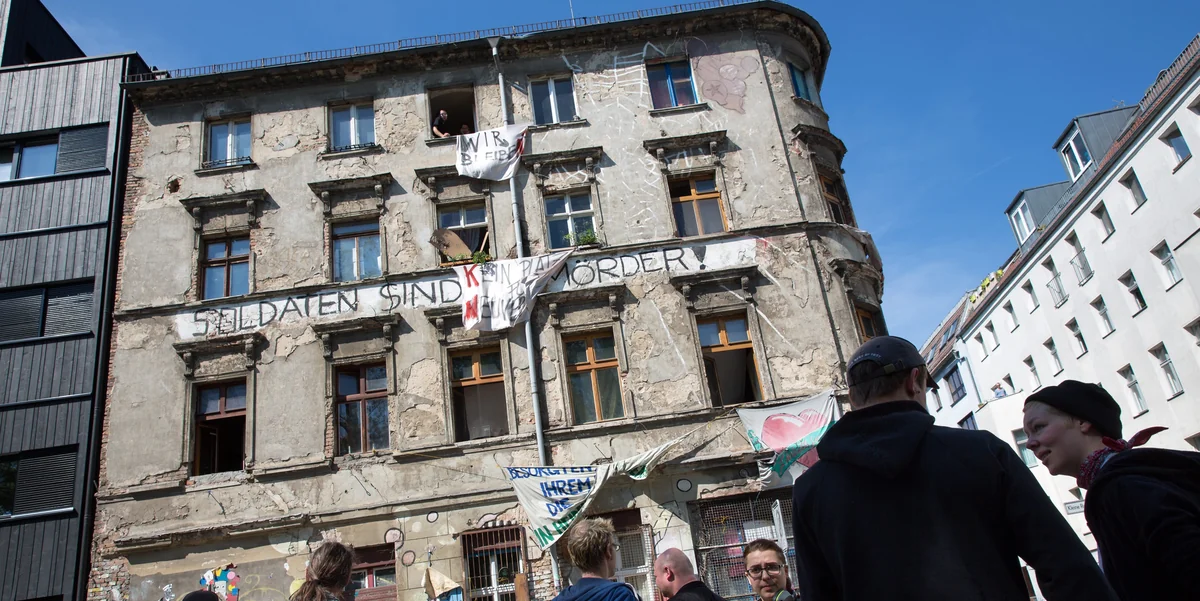 Das 1823 erbaute und unter Denkmalschutz stehende Eckhaus wurde im Mai 1990 besetzt; seitdem dient es wechselnden Bewohnern als alternatives Wohnprojekt. Mitten in der schick sanierten Spandauer Vorstadt, unweit des Rosenthaler Platzes und gegenüber dem Garnisonsfriedhof, wirkt es wie eine Trutzburg aus der Vergangenheit. Aus den Fenstern hängen Transparente, von der graubeigen Fassade blättert großflächig der Putz, Parolen gegen Soldaten und Nazis und einst bunte Graffiti sind längst verblasst.