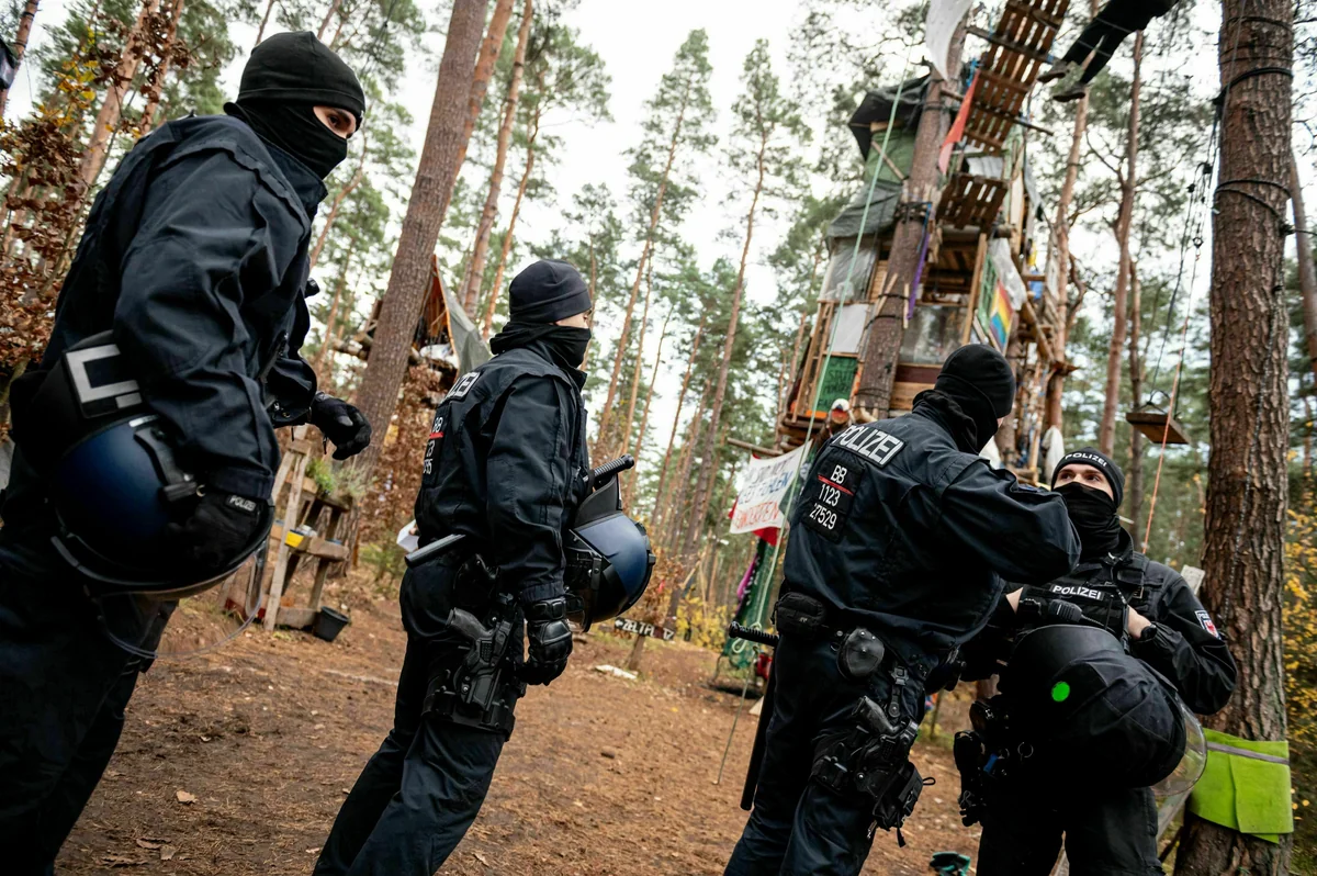 In zehn, fünfzehn Meter über dem Boden in den alten Kiefern kann man Aktivist:innen und Polizist:innen – alle in schwarzer Kluft und mit Klettergeschirr ausgestattet – kaum voneinander unterscheiden. Doch die Rollen sind im Wald von Grünheide neben der Tesla-Fabrik klar verteilt. Während die einen versuchen, die Bäume und Baumhäuser besetzt zu halten, wollen die behördlichen Kletterer sie herunterholen. Und das gelingt: Nach und nach werden die etwa ein Dutzend Waldschützer:innen aus dem mit Flatterband abgesperrten Bereich herausgeleitet – unter Rufen der Umstehenden: „Du bist nicht allein!“