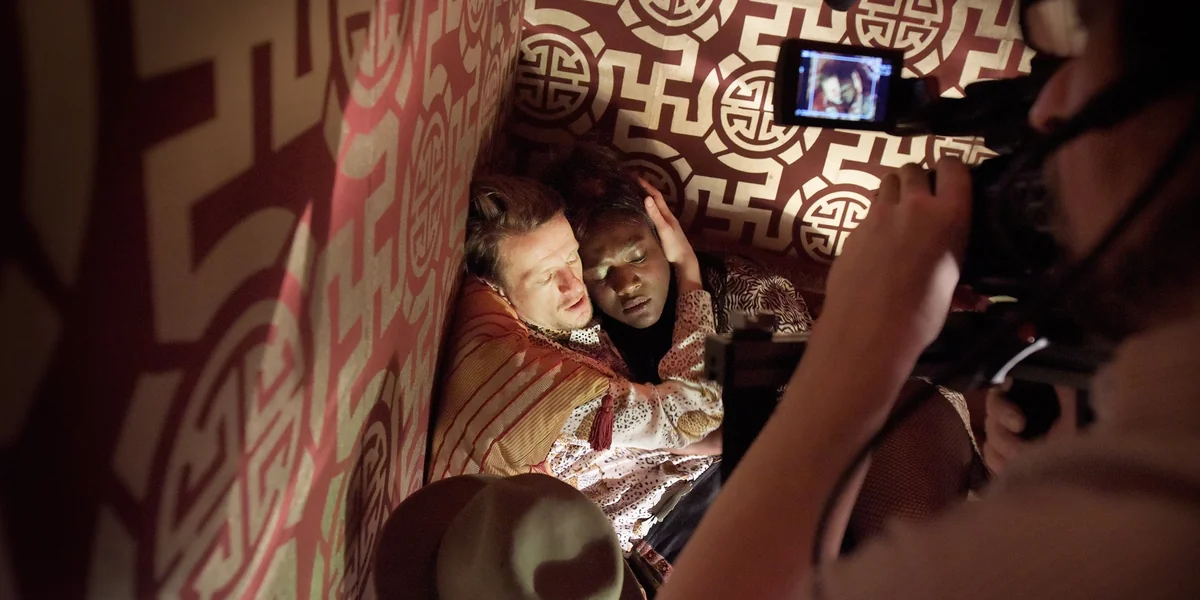 Auch Bühnenbildner Aleksandar Denić greift sie auf. Seine Pariser Halbwelt, gegen die Castorf die deutsche Provinz vertauscht, zeigt die historisch schillernde Kehrseite der bürgerlich-imperialen Metropole. Am Eingang der Bar L’ ENFER streckt eine riesige Teufelsfratze dem Besucher die Steinzunge heraus, darauf stapelt sich ein Asia-Puff, im Hinterhof führt eine schwach befunzelte Treppe zur Métrostation „Stalingrad“. Darüber Stromkabelsalat, indigene Masken und unzählige Plakate, die für Kolonialprodukte oder Horrorfilme (Angst vor dem Fremden!) werben. Über dem Screen, auf den das Schauspiel live aus den Innenräumen übertragen wird, prangt in Jugenstiltypo: „Exposition Coloniale“.
