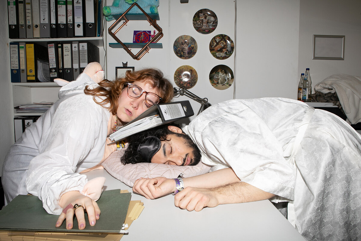 In „Müßiggangster“ geht es ebenfalls um Biografisches, diesmal um Arbeit und Faulheit – aber nicht als Klamauk, sondern als präzise gesetzte Kritik an der politischen Gegenwart. Die Szene, an der sie arbeiten, als das Gespräch im Foyer endet, ist eine Art Einführung: Wie man richtig nichts tut. Gammeln. Lümmeln. Verweilen. Chillen. Trash-TV gucken, in Schubladen wühlen. Snacks oder Spaßgetränke in Griffweite bereithalten. Für Fortgeschrittene: Wolken beobachten.
