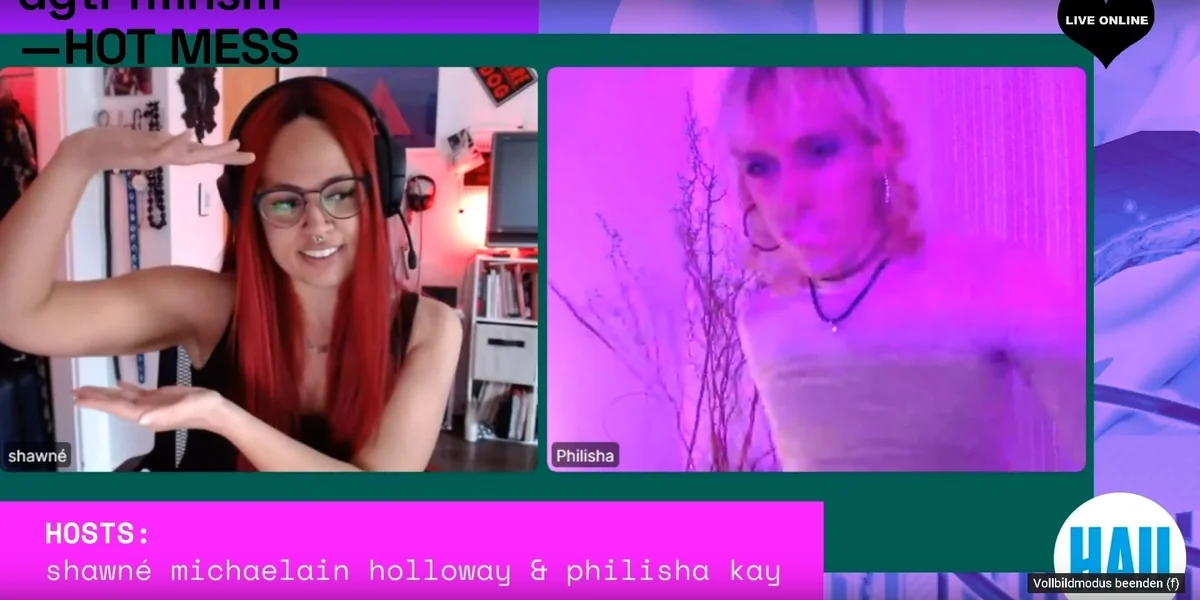Eine Totalüberforderung für die Sinne war am nächsten Tag ein Stream, der als Tutorial für die Entwicklung von Gesichtsfiltern für Instagram angekündigt war, sich aber als ein Gespräch zwischen den russischen Künstlerinnen Alla Popp und Ksti Hu über ebendiese Filter entpuppte. In Russland hätten die Filter eine politische Bedeutung, erfuhr man von Popp, die selbst Filter entwickelt, die den auf Instagram propagierten Schönheitsidealen widersprechen.