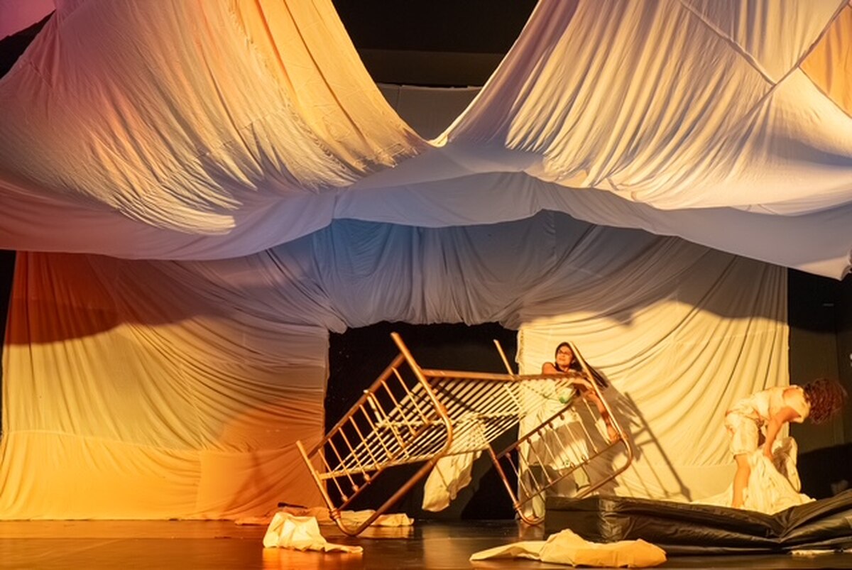 Das riesenhafte Gebilde aus kaputten und gespendeten Bettlaken weckt Assoziationen an ein unbeschriebenes Blatt Papier, aber auch an biedere Unterröcke. Wegen eines Krankheitsausfalls steht Treptow selbst auf der Bühne und spielt neben Prijana Kumar und Karoline Sachslehner eine der drei Frauen, die es satt haben, immer nur die Inspirationsquelle von irgendwelchen selbst ernannten Genies zu sein.