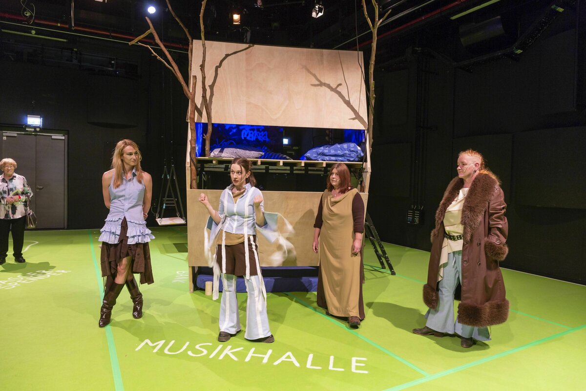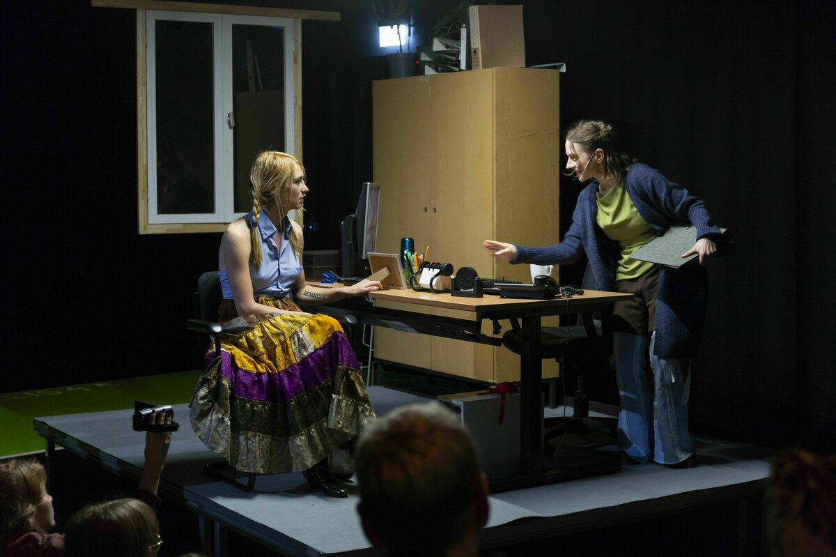 Vier Originalsitze der Deutschen Bahn haben es in die Hochschule für Schauspielkunst Ernst Busch geschafft, denn Janina Berthold hatte sich als Bühnenbild ein Zugabteil gewünscht. „Die WhatsApp-Nachricht, dass du die Sitze gekriegt hast, habe ich mindestens zehn Mal gelesen“, erinnert sich Berthold und schaut zur Bühnenbildnerin Madalena Wallenstein de Castro. Die hat die gesamte Zuschauertribüne in die Verbannung geschickt, um Platz zu schaffen für weitere Bühnenbilder: ein Filmstudio, ein geräumiges Baumhaus mit Schaukel und das Büro des Frauen*salons mit angeschlossenem Museum der Obdachlosigkeit.