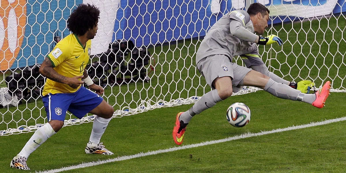 11. Minute: Tooooooooooooooooor: Thomas Müller trifft nach einem Eckball zum 1:0 für Deutschland. David Luiz lässt Müller nach einer Kroos-Ecke vollkommen ungestört an den Ball kommen. Mit dem Außenriss schiebt er den Ball an Cesar vorbei ins Tor.
