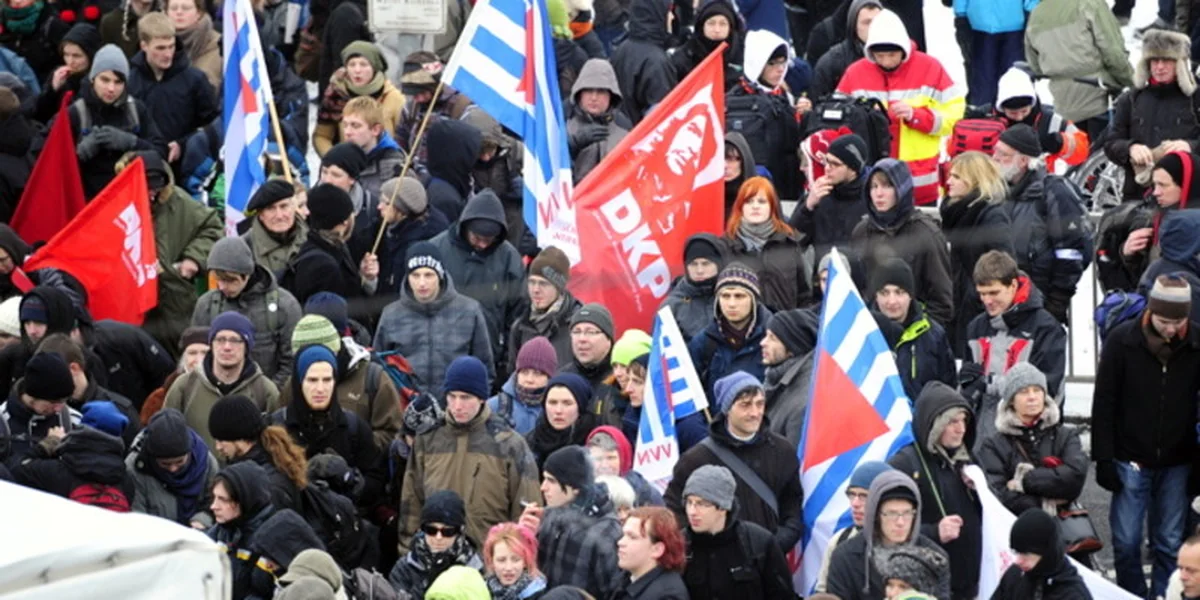 Comeniusplatz. Inzwischen haben sich rund 1.000 Demonstranten zum Rundgang Täterspuren versammelt. Immer noch kommen neue Busse an. Die Demonstranten bieten einen bunt-durchmischten Anblick: Viele Antifas sind darunter, aber auch Senioren. Die Piraten, die Linkspartei und die Grünen machen mit Fahnen auf ihre Parteien aufmerksam.