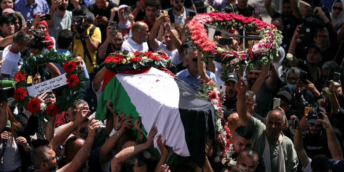 TEL AVIV taz | Tausende Palästinenser:innen versammelten sich am Donnerstag zur Trauerfeier für die Al-Dschasira-Journalistin Shireen Abu Akleh, die am Vortag in Jenin durch eine Kugel getötet worden war. Dichtgedrängt folgten sie der Prozession, bei welcher der in eine palästinensische Fahne gewickelten Leichnam durch die Straßen Ramallahs getragen wurde.