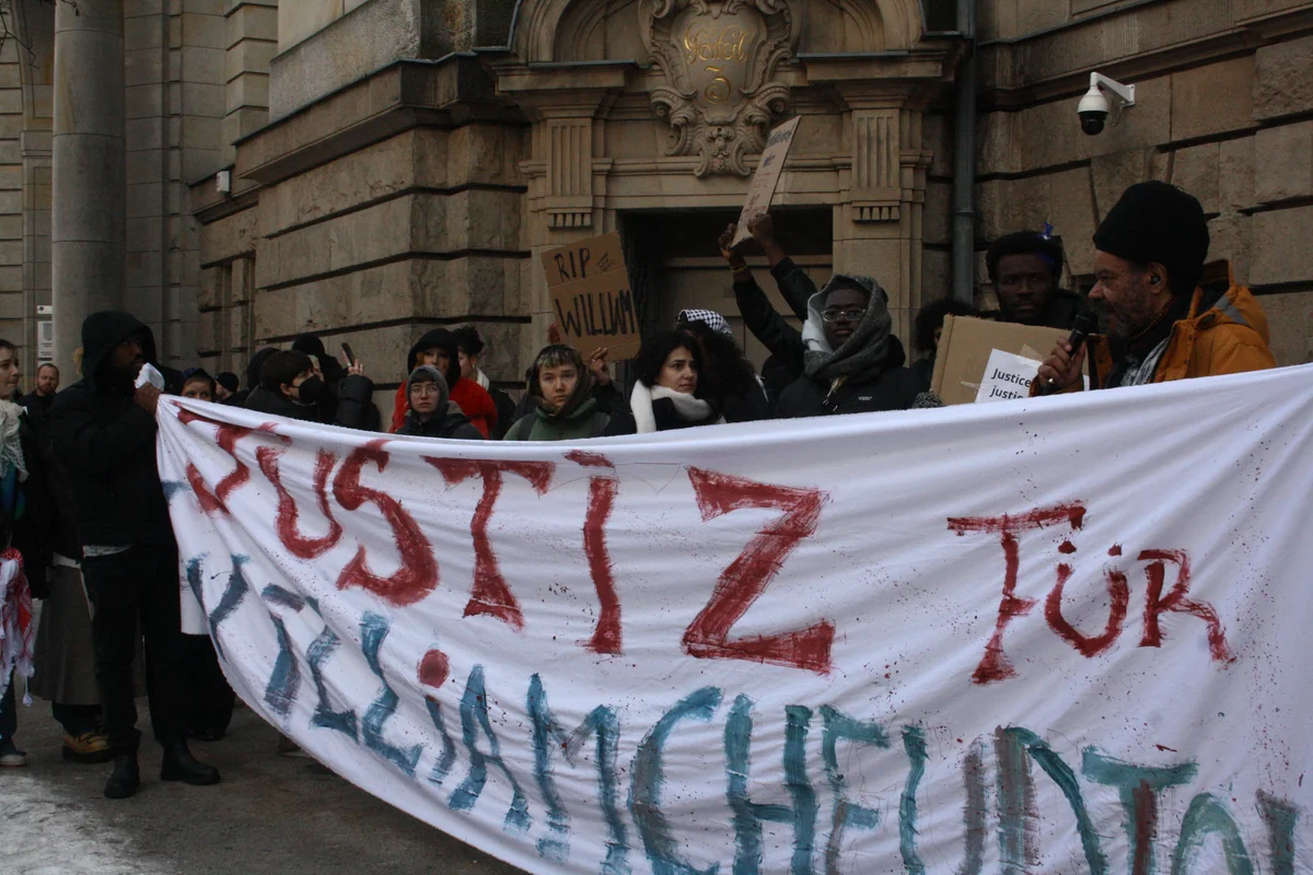 Zum Ende der Urteilsbegründung wurden Stimmen aus dem Publikum laut. „Das war Mord“ und „Wir wollen Gerechtigkeit“ riefen Zuschauer*innen dem Richter entgegen. Die Empörung über das Urteil setzte sich vor dem Gerichtsgebäude fort. Dort versammelten sich rund 30 Personen zu einer Kundgebung und riefen Slogans wie „Shame on you“ oder „No Justice no Peace“.