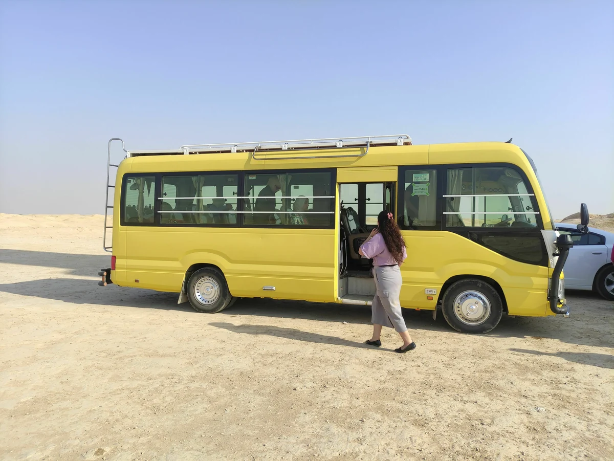 „Gott sei Dank ist unser Sicherheitsniveau heute hoch“, sagt Ghada al-Makhzoumi. Sie ist die Schwester von Ali, Geschäftsführerin des Reiseveranstalters und arbeitet als Tourguide. Es ist 8.30 Uhr morgens, der weiße Mitsubishi-Bus zieht an flacher Wüste vorbei. Der Sänger Khamis Abdulwahab fängt an, auf seiner Oud zu spielen und zu singen. In dem kleinen Bus sitzen viele junge Iraker*innnen, in der zweiten Reihe Ghada al-Makhzoumi. Die 48-Jährige trägt ein pinkes T-Shirt und ist gut gelaunt. „Die Idee ist, Saiteninstrumente wie Oud, Qanun und andere arabische und orientalische Instrumente zu spielen und so eine besondere Atmosphäre zu schaffen“, erklärt al-Makhzoumi.