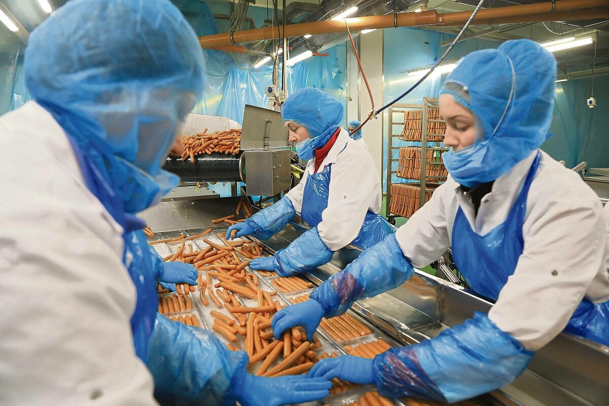 Lastwagen rollen an diesem Morgen über die Hauptstraße, vorbei an hohen, schwarzen Fahnen, darauf steht: „Richtig gut, die Wurst“. Am Ende der Straße öffnen und schließen die Schranken, um Lkws mit unverarbeitetem Fleisch auf das Gelände zu lassen. Eberswalder selbst schlachtet schon lange nicht mehr. Drinnen wird das Fleisch zur Wurst.