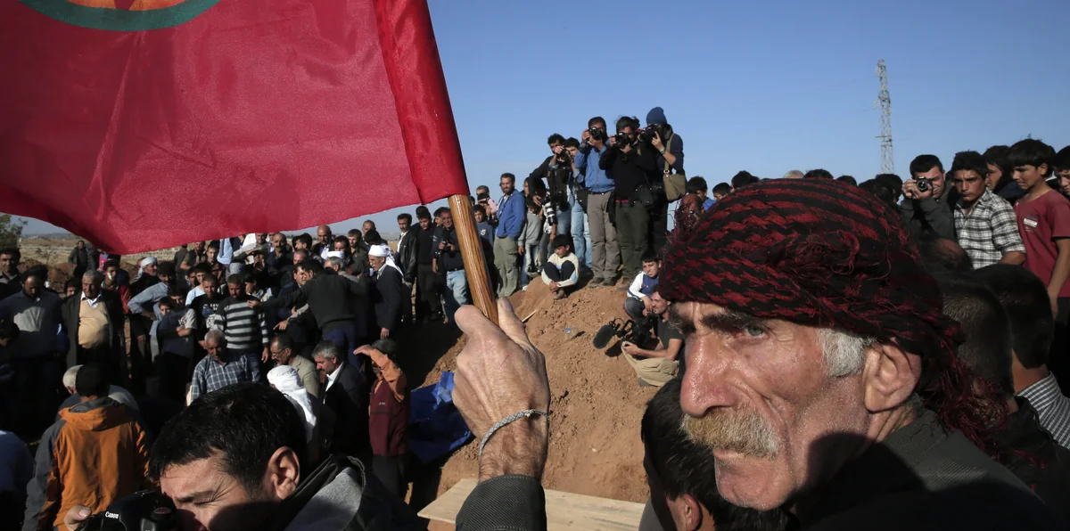 Hunderte Kurden stehen auf dem sandigen Friedhof, Fahnen mit dem Konterfei Abdullah Öcalans, dem inhaftierten Chef der verbotenen kurdischen Arbeiterpartei PKK, werden geschwenkt. Junge Männer in Pluderhosen und olivgrünen Overalls, der Uniform, die auch Kämpfer der PKK tragen, schreien „Kobani wird zum Grab für den IS“. Die Menschen rufen bei jedem Sarg, der an ihnen vorbeigetragen wird „Sehit“ – „Märtyrer“. Die Bürgermeisterin jubelt mit. Ihr langes braunes Haar hat sie mit einem Band in den Farben der kurdischen Flagge, Rot, Weiß und Grün, zusammengebunden.