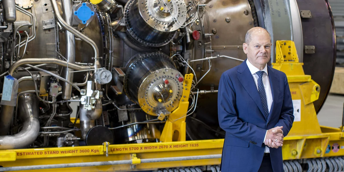 Der Bundeskanzler an der frisch gewarteten Turbine der Nord Stream 1. Souveräntät sieht anders aus Foto: Christoph Reichwein/imago
