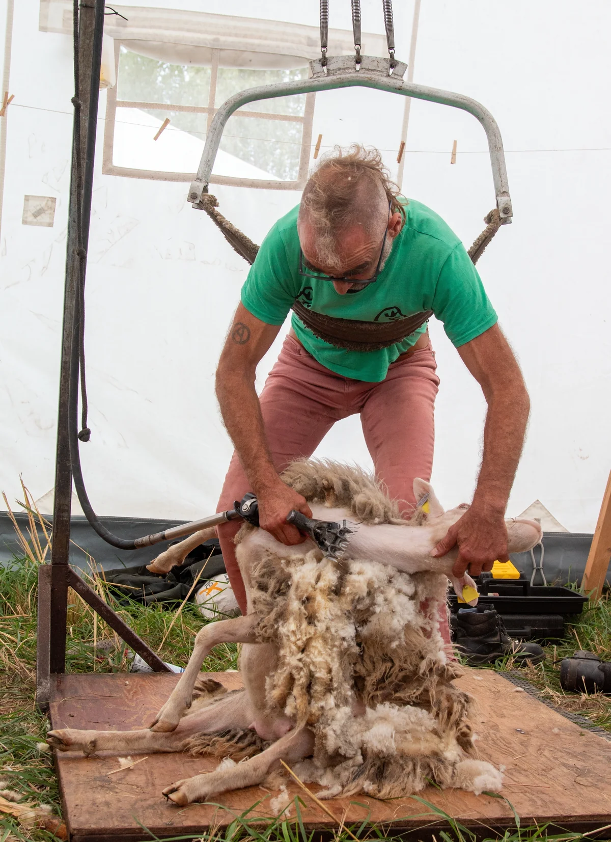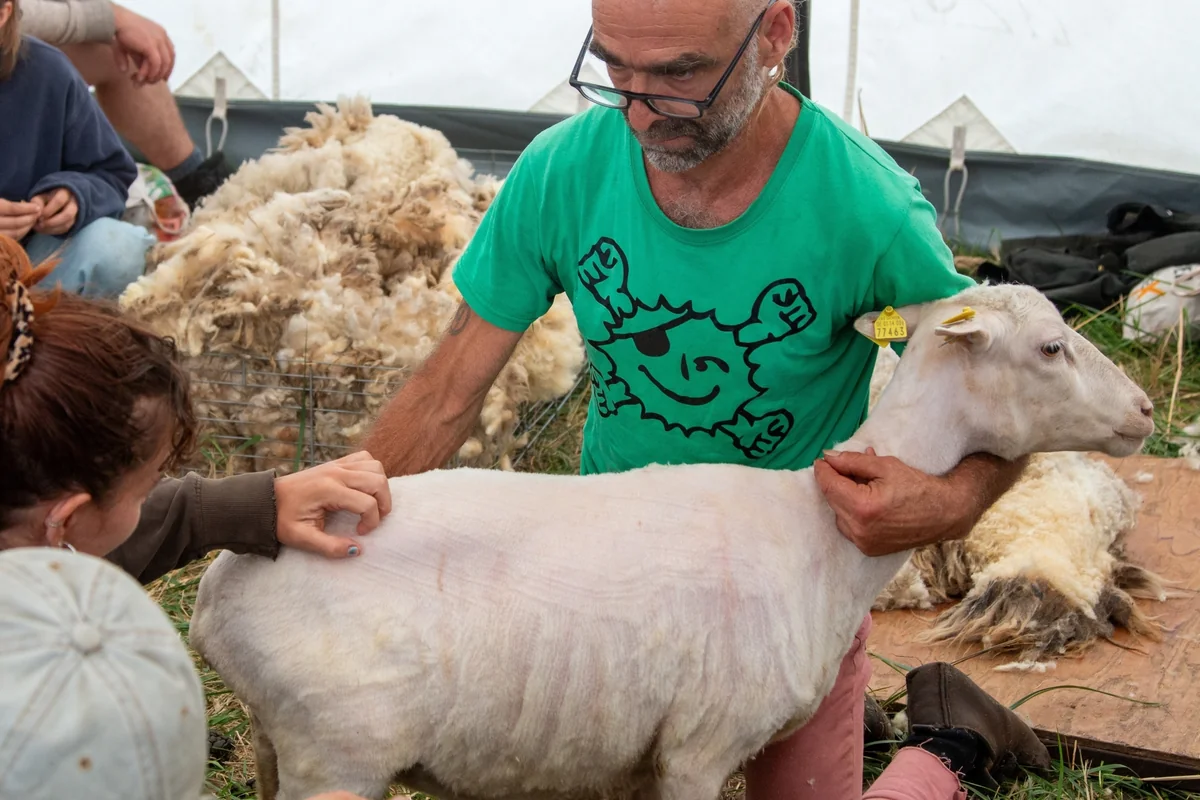 Obwohl die Schafe noch nicht da sind, ist der Schafschur-Workshop gut besucht. Teilnehmer:innen des Camps drängen sich in dem alten Armeezelt, selbst vor dem Eingang hat sich eine Menschentraube gebildet. Oliver Junker Matthes, Spitzname Ohm, steht vor der Schuranlage, die etwas an einen Galgen erinnert, und referiert schon mal über die Ökonomie der Schafschur.