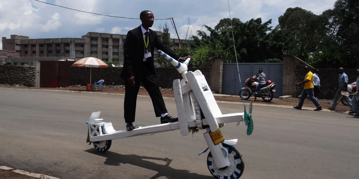 Sobald das Gefährt an Geschwindigkeit zulegt, dreht sich der grüne Propeller an der Stoßstange. „Klack-Klack-Klack“. Die Antenne flattert im Fahrtwind. Alexi Bizimungu Kaduha lacht: das Klappern des Propellers, der Fahrtwind im Gesicht, die begeisterten Gesichter der Passanten – der 32-Jährige genießt es jeden Morgen, auf seinem übergroßen Tretroller quer durch Goma zur Arbeit zu fahren.