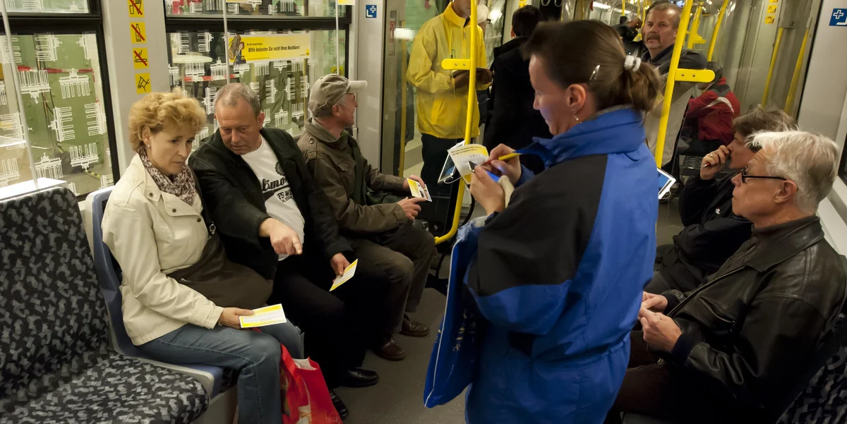 Eigentlich fühlen sich alle ziemlich ähnlich an: Eher hart und unbequem. Nur bei einem hat man für den Bruchteil einer Sekunde den Eindruck, zu versinken. „Welcher darf’s denn sein?“ fragt Dan Seifert mit seiner gelben Sitzprobenjacke. Die ausgewählte Nummer tippt Seifert in ein I-Pad, so wie er es in den kommenden zwei Wochen wohl noch tausende Male tun wird. Am Ende ihrer selbst bezeichneten „Road Show“ will die BVG vier der von ihr gezeigten Sitze verlosen. Man verlässt den U-Bahnzug mit dem Gefühl, etwas sehr Wichtiges geleistet zu haben.
