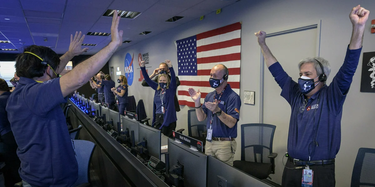 Als die Erfolgsmeldung in Gestalt zweier körniger Schwarz-Weiß-Bilder endlich eintraf, sprangen die Angestellten von ihren Sitzen, rissen die Arme hoch und schrien Erleichterung und Triumph heraus. „Nimm dies, Jezero“, brüllte einer.