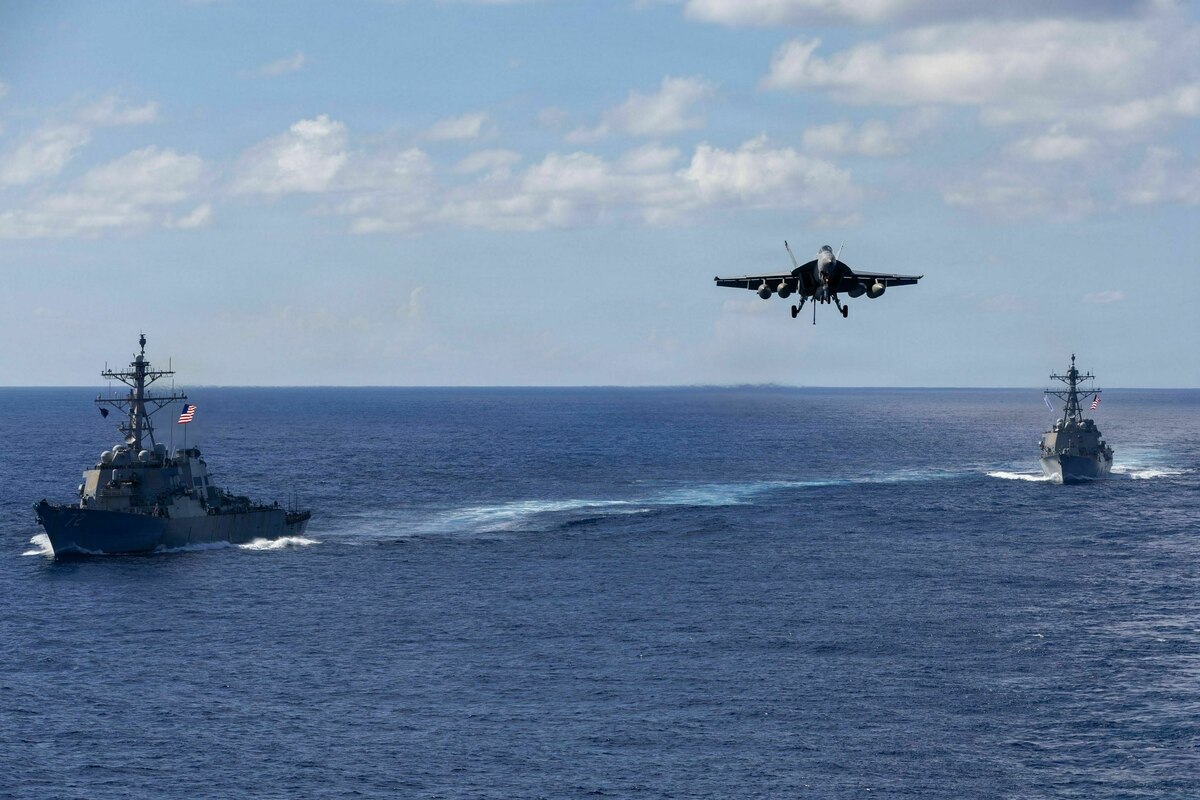 US-Kriegsschiffe und ein F/A-18 Hornet-Kampfflugzeug Foto: U.S. Pentagon/dpa