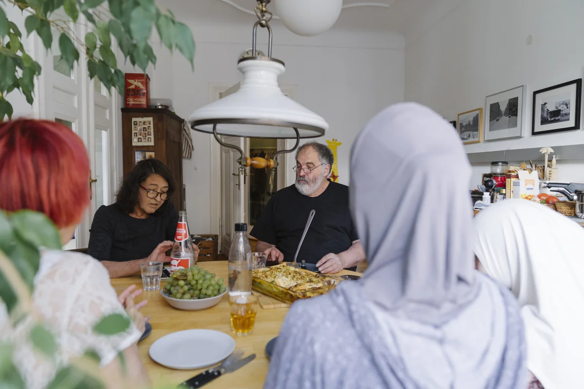 Während Nina, Maryna und Salma draußen fotografiert werden, erzählen Dörte und Frank in der Küche von den vergangenen Wochen. Dörte hat für Maryna einen Deutschkurs bei der Volkshochschule organisiert. Zur Anmeldung konnte sie nicht mit. Maryna bekam einen Platz für einen Onlinekurs zugeteilt – dabei hat sie gar keinen Laptop und kennt auch noch gar nicht das lateinische Alphabet. Nun versuchen sie es noch einmal mit einem anderen Kurs.