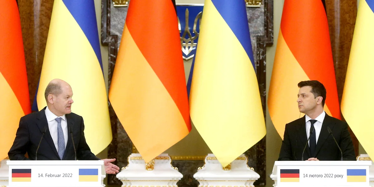 Auch die Aufforderung des Auswärtigen Amtes, deutsche Bürger sollten die Ukraine möglichst verlassen, wischt er beiseite. Die deutsche Botschafterin sei ja da, darüber freue er sich. Wahrlich hat Selenski ganz andere Sorgen als die Deutschen: Ukrainische Unternehmer:innen verlassen das Land in Scharen, die Panik, vor der der Präsident immer gewarnt hatte, scheint nun doch um sich zu greifen. Scholz nickt seinem Gastgeber aufmunternd zu: „Wir stehen ganz eng an Ihrer Seite.“ Deutschland sei der kräftigste Geldgeber der Ukraine und werde das auch bleiben.