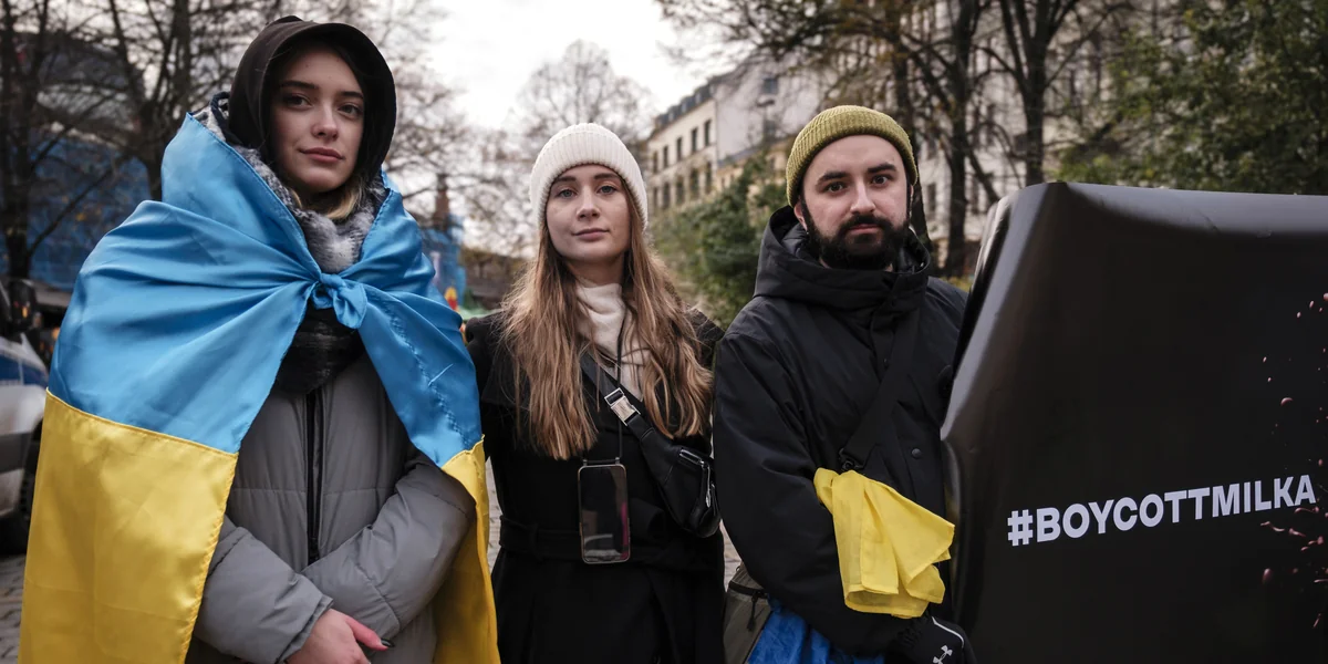 Wie das aussieht, kann man ein paar Tage später auf dem Hackeschen Markt in Berlin-Mitte sehen. Es ist der letzte Sonntag im November, die Temperaturen sind unter null gefallen. Auf dem Platz versammelt sich eine kleine Gruppe. Neben ukrainischen Fahnen fallen zwei Demonstrantinnen auf, die in schwarz-weiß-lila Kuhkostümen stecken. Ihre Hörner und Vorderhufe sind blutverschmiert. Auf großen Plakaten steht: #BoycottMilka. Dazu das Bild eines Stücks Schokolade in Form einer Artilleriegranate.