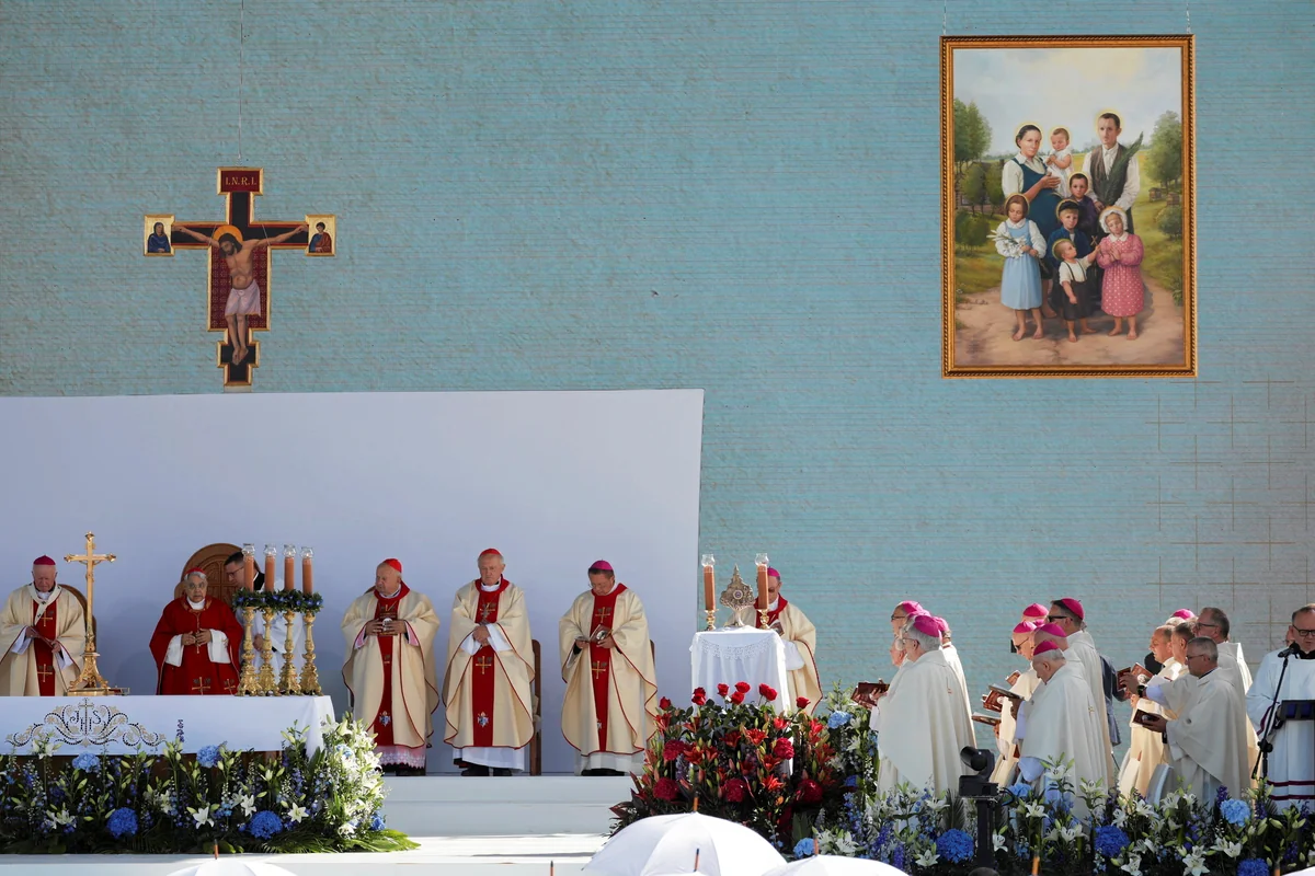 U nter sengender Sonne verfolgen rund 35.000 Menschen die Seligsprechungsmesse der Familie Ulma im polnischen Dorf Markowa. Allein 80 Bischöfe und über 1.000 Priester erweisen den „Glaubens-Märtyrern“, die Papst Franziskus im Dezember 2022 anerkannte, ihre Ehre. Sie tragen zumeist weiße Soutanen. Manche auch große weiße Schirme gegen die Sonne. Da im Sportstadion des Dorfes, in dem ein riesiger Altar für die Freiluftmesse aufgebaut wurde, nicht genug Platz ist für die Menschenmenge, hängen überall im Dorf große Bildschirme und Lautsprecher. „Gloria“ und „Alleluja“ schallt es durch die Straßen, Feldwege und über die abgeernteten Felder hinweg.