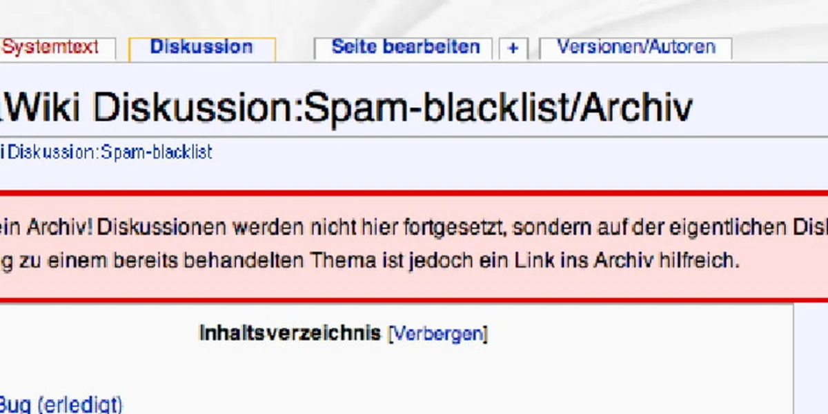 Doch plötzlich sind dort die Seiten, die unter www.bund-freiburg.de abgelegt sind, nicht mehr zu finden. Und die Zugriffszahlen sind in den letzten Tagen eingebrochen. Mayer ist kein Verschwörungstheoretiker, er glaubt auch nicht an eine Manipulation durch Google. Er hat einen anderen Zusammenhang entdeckt: Google präsentiert die Seiten nicht mehr, seit sie im interaktiven Web-Lexikon Wikipedia in einer Spam-blacklist/Archiv#vorort.bund.net.2Fsuedlicher-oberrhein.2Fakw-leibstadt.html:Spam-Liste auftauchen.