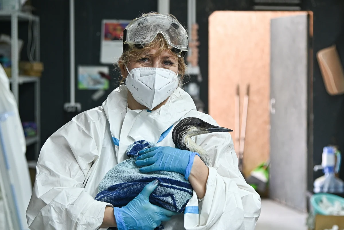 Sie wurden von Anwohner:innen und Aktivist:innen, die die Küste von Ölrückständen säuberten, in das Zentrum gebracht. Die zur Hilfe gekommenen Freiwilligen waschen die Vögel mit speziell zubereiteten Lösungen. Außerdem bringen sie den Mitarbeiter:innen des Zentrums Essen und Wasser.