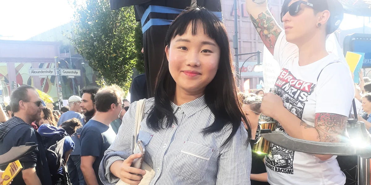 Nammyoung Hong, 25, hat sich auf den Sockel eines Sonnenschirms gestellt, um besser sehen zu können, auf Zehenspitzen schießt sie mit dem Handy Fotos von der Menge. Hong kommt aus Südkorea, seit einem Jahr studiert sie in Berlin, im Masterstudiengang Historische Urbanistik an der Technischen Universität. Es ist ihre erste Demonstration in Deutschland, sie strahlt über das ganze Gesicht: „So etwas habe ich noch nicht erlebt, es ist sehr bewegend für mich, so viele Menschen für Freiheit und gegen Ausgrenzung auf der Straße zu sehen.“ Hong, die in ihrem Heimatland neben dem Studium als freie Journalistin arbeitet, will ihren Freunden dort davon erzählen. Sie sagt, dass die Demonstration in Berlin eine Inspiration für sie sein könnte.