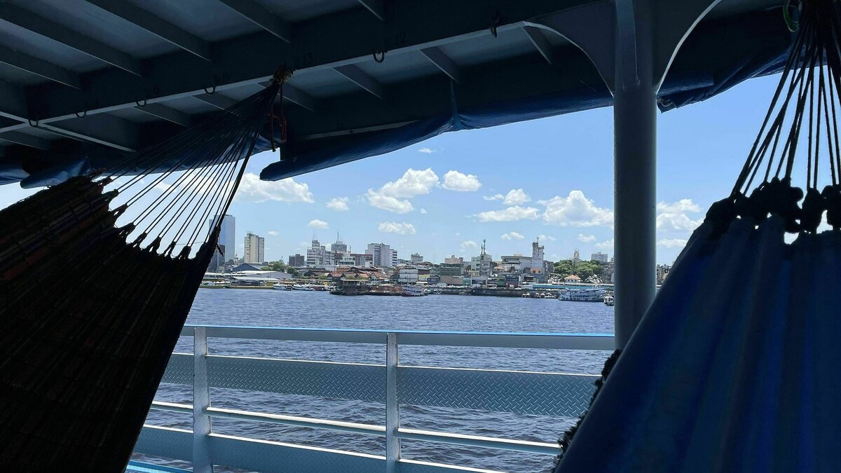 An diesem drückend heißen Vormittag wimmelt es im Passagierhafen von Manaus von Menschen. Zwei große Dampfer legen Richtung Santarém ab. Die „Estrela“ hat ihren schweren Dieselmotor zuerst angelassen, ihre Stahlkonstruktion mit drei Decks bietet Hängemattenhaken für fast 1.000 Passagiere. Manche davon sind Stammgäste, manche zum ersten Mal dabei, die meisten sind Brasilianer, einige aus anderen Ländern. Soziale Unterschiede sind hier auf zwei Kategorien reduziert: Die auf ihr Geld schauen müssen, fahren für umgerechnet rund 20 Euro die 876 Flusskilometer in der selbst mitgebrachten Hängematte und teilen sich wenige Duschzellen, in denen Flusswasser aus dicken Rohren strömt.