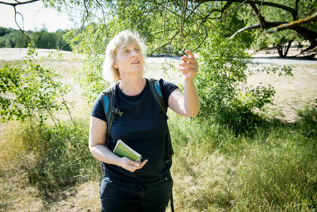 Wir steigen eine Holztreppe neben dem Hang hinab, durchqueren eine hochgewachsene Wiese mit rötlichen Gräsern und nähern uns den Tümpeln. Viel Wasser ist nicht drin, aber Weiden und Schilf deuten an, dass noch Wasser im Boden ist, erklärt Wellbrock. Mit dem Aussehen der Bäume ist sie auf den ersten Blick zufrieden. „Sie sehen noch üppiger aus als letztes Jahr“, sagt sie. Bei einer Kiefer untersucht sie ein paar Zweige, an denen spinnennetzartige Fäden hängen. Schädlinge sind das wohl nicht. Dann zeigt sie auf den Waldrand in einiger Entfernung und stellt fest: „Die hat es nicht geschafft.“ Zwischen vielen gesund aussehenden Kiefern steht eine im trockenen Rostbraun erstarrte.