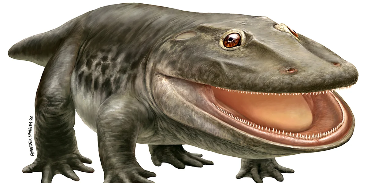 Gefunden wurden Fossilien von diesem Süßmö 2013 und 2018 zwischen Kaiserslautern und Trier, erstmals offiziell beschrieben jetzt im Januar 2024. Gelebt haben die Pfälzer*innen vor etwa 300 Millionen Jahren. Damals wahrscheinlich unterschätzt: sein Niedlichkeitsfaktor. Dafür war das Vieh, 60 Millionen Jahre vor den ersten Dinosauriern auf der Welt, einfach doch zu sehr eines der größten Raubtiere. Das sieht man dem Grinsefrosch aber auch in der Illustration vom Naturkundemuseum Berlin ein klein wenig an.