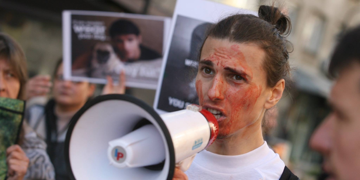 So es das Wetter zulässt, wird alle zwei Monate auf dem Vitosha-Boulevard im Zentrum der bulgarischen Hauptstadt Sofia angerichtet: Auf einem Tisch liegt ein Mensch inmitten von Gemüse. An seiner nackten Haut klebt künstliches Blut. Umstehende „bearbeiten“ den Körper mit überdimensional großen Messern und Gabeln aus Holz. „So simulieren wir, wie Fleisch zubereitet wird“, sagt Nikola Donev.