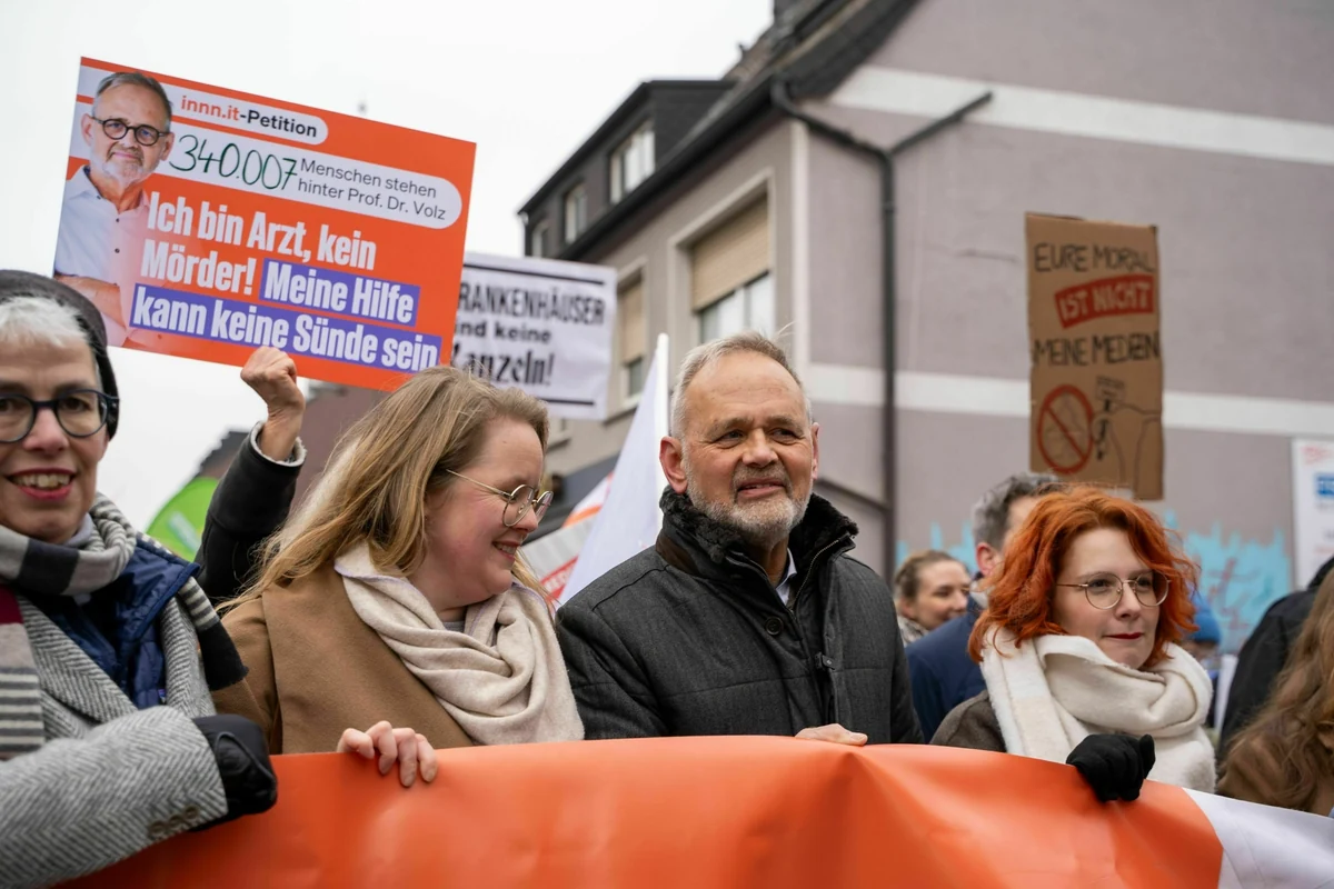 Zwei Stunden vorher weht ein schneidender Wind über den Marktplatz im nordrhein-westfälischen Hamm. „Ich bin Arzt und kein Mörder“, sagt Volz auf einer Bühne stehend ins Mikrofon. „Meine ärztliche Hilfe kann keine Sünde sein.“ Die Menge applaudiert. „Eine Frauenklinik ist kein Gebetshaus, ein Uterus kein öffentlicher Raum und ein Arzt kein Priester“, ruft Volz. „Wir sind stolz auf Professor Volz“, ruft die Menge zurück, wieder und wieder. Rund 550 Menschen trotzen den eisigen Temperaturen, um ihre Unterstützung zu demonstrieren.