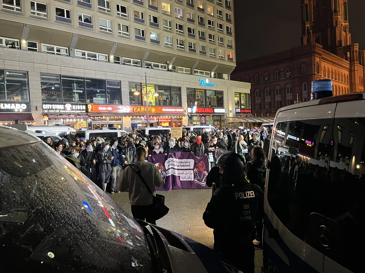 Trotz Verbot haben sich am Dienstagabend hunderte Palästina-Aktivist*innen am Alexanderplatz versammelt. Zum Teil war die Lage unübersichtlich.