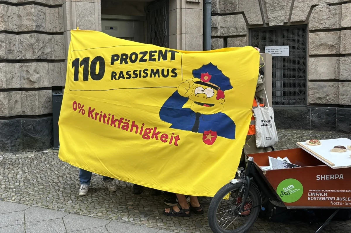 S. habe mit seiner Aktion „inhaltlich einen guten Punkt gemacht“, sagt ein Sprecher der Gruppe zur taz. Das Problem seien nicht die Schmierereien, sondern die rassistischen Strukturen in der Polizei, findet er. Während der Aktion ist ein rechter Streamer anwesend, filmt die aufgehängten Bilder und die Demonstrierenden, die ihre Gesichter hinter einem Banner verstecken: „110 Prozent Rassismus. 0 % Kritikfähigkeit.“