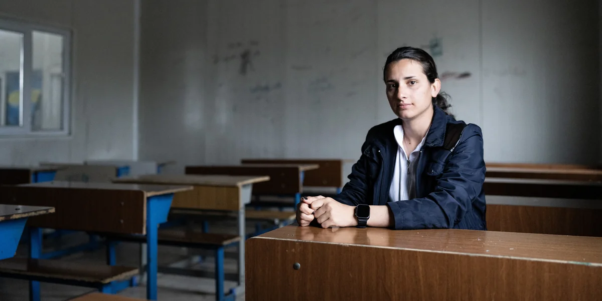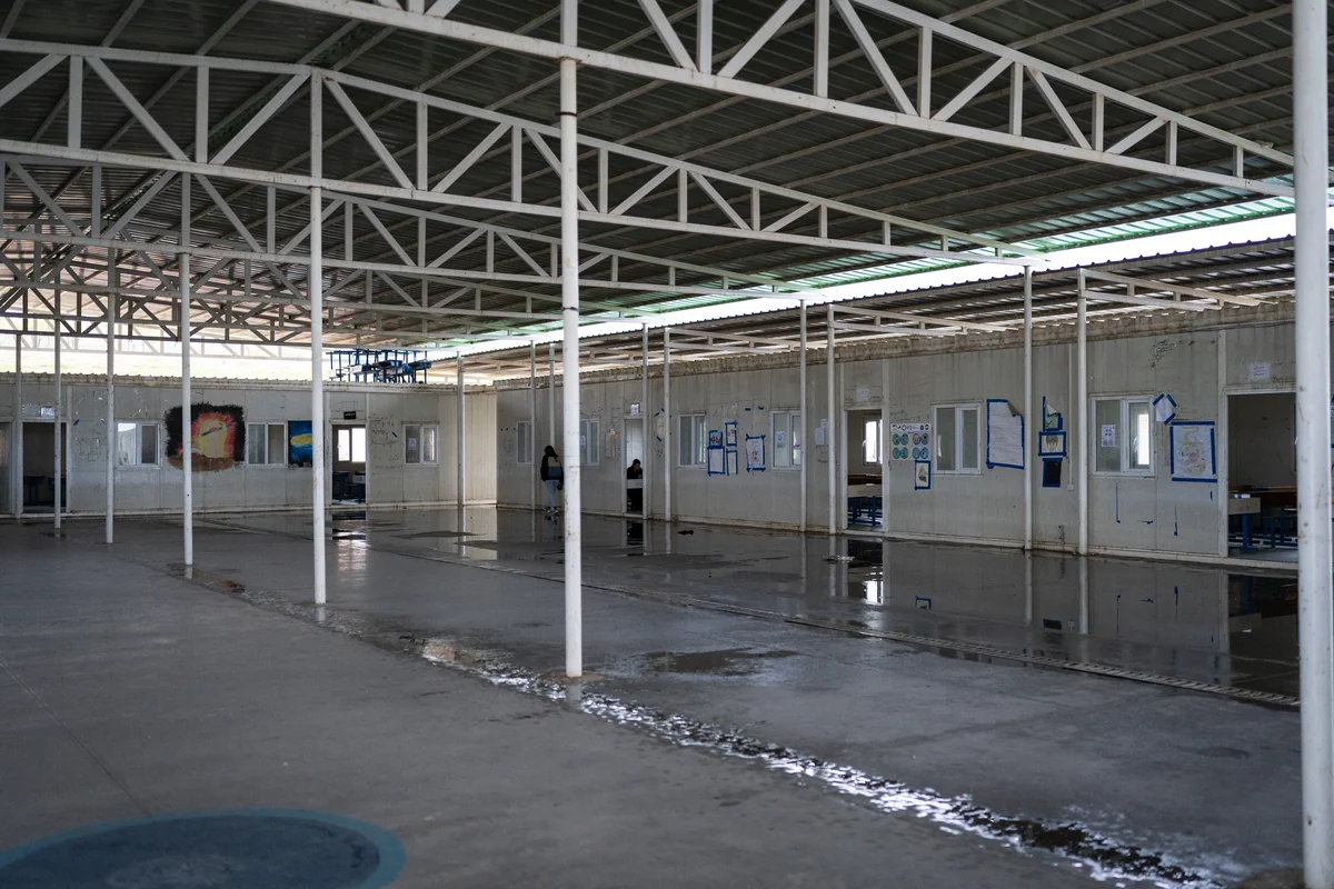 Im Qadia-Flüchtlingslager zieht mittlerweile das nächste Gewitter auf, Donner knallt vom Himmel herunter, der Regen prasselt hart und laut auf das Wellblech über Berivan Elyas und Shahnaz Ravo. Sie stehen im Innenhof ihrer Schule, ein flacher Containerbau mit offenem Innenhof, von dem die Klassenzimmer abgehen. An den Wänden kleben Plakate, die über Landminen aufklären und davor warnen, sie aufzuheben. Etwa 500 Kinder lernen hier im Schichtbetrieb, erzählen sie: Morgens wird auf Kurdisch unterrichtet, abends auf Arabisch. „Während der Klassenarbeiten sitzen bis zu 50 Kinder in einem Raum“, sagt Berivan. „Es ist deswegen schwierig, gute Noten zu schreiben.“