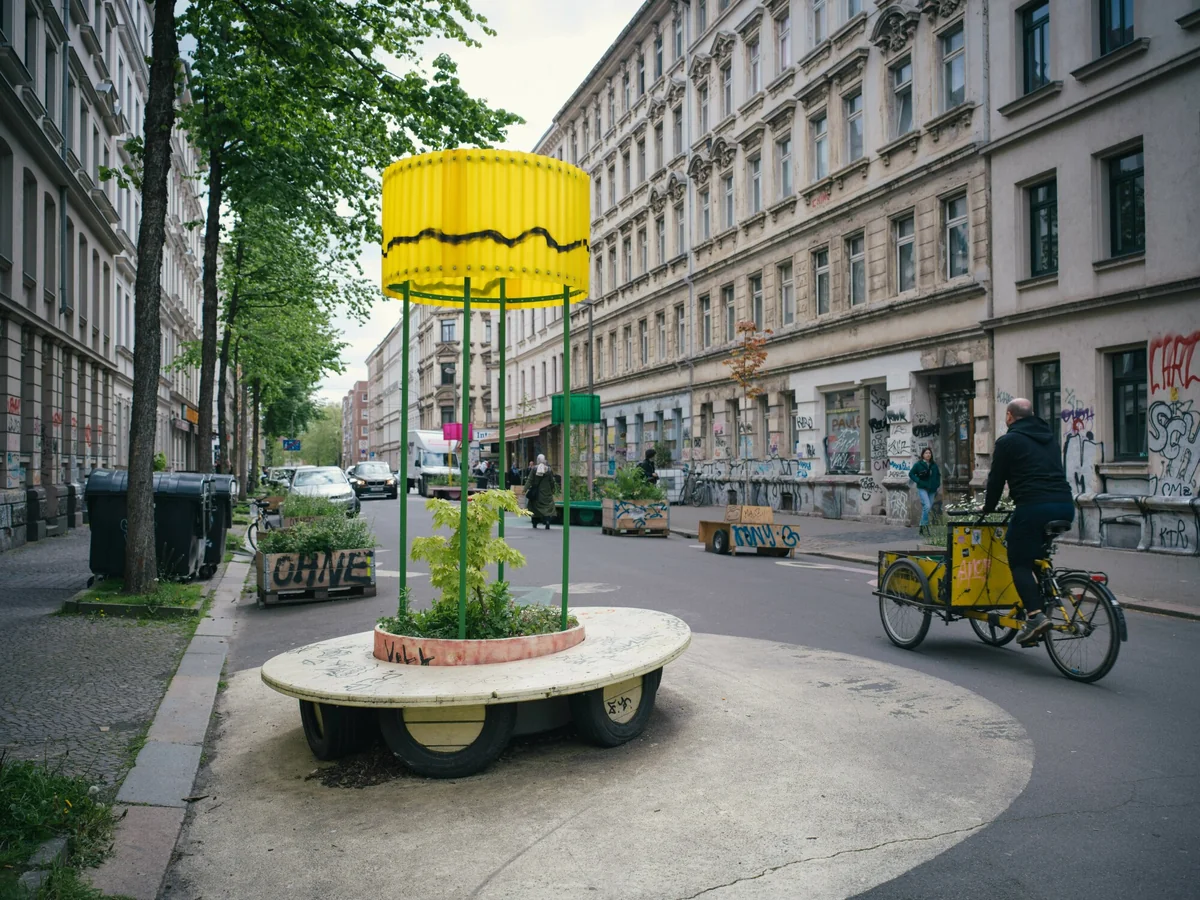Das Pilotprojekt in Leipzig liegt in der Hildegardstraße, die direkt die bekannte Eisenbahnstraße im Osten der Stadt kreuzt. Vor etwa einem Jahr malte der Verein dort mitten auf den Asphalt drei bunte Kreise: anderthalb Meter Radius, einer rosa, einer grün, einer gelb. Darauf landeten runde Sitzbänke in den gleichen Farben, mit Blumenkübeln in der Mitte und einem bunten Lampenschirm obendrüber. Spielstraßenschilder sollen die Autos bremsen, damit Nachbar:innen zusammenkommen können. So die Idee.