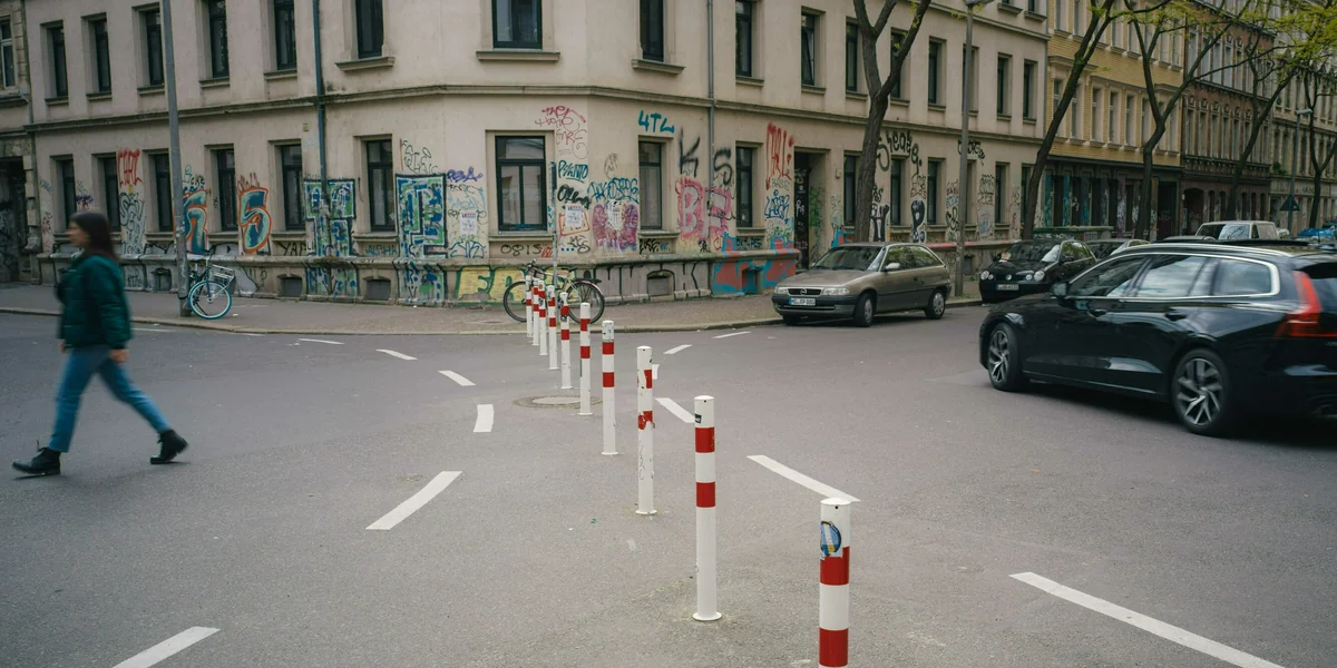 A riane Jedlitschka steht mitten auf der Straße zwischen Wohnblocks aus malerischen Altbauten. Vor ihr zehn diagonal aufgereihte Poller auf einer Kreuzung. Hinter ihr, „die umkämpftesten 60 Meter in Leipzig“, sagt sie: das Superblock-Pilotprojekt im Osten der Stadt.