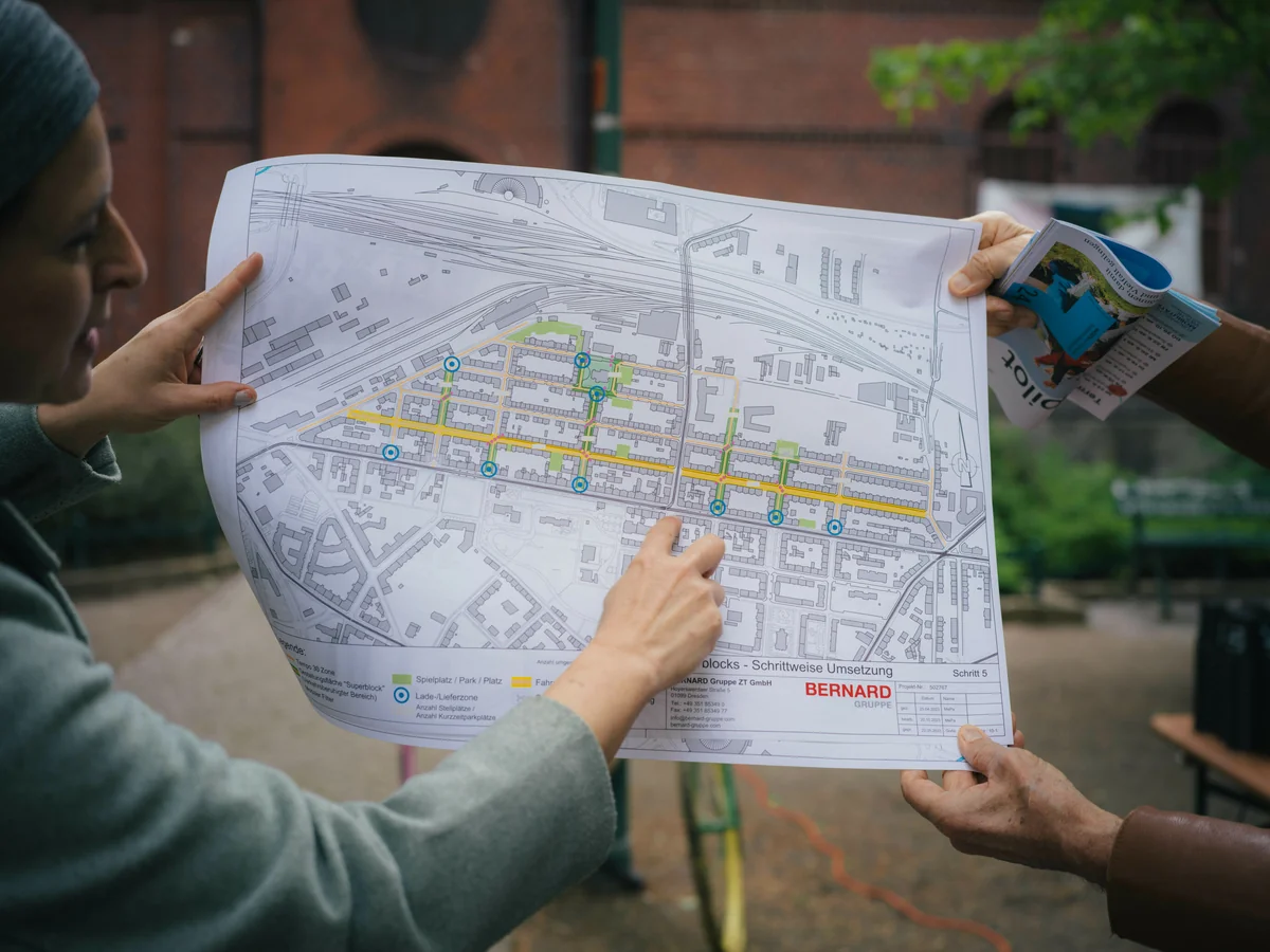 Und weiterdenken, das bedeutet auch: Der Superblock hier in Leipzig wird tatsächlich ausgeweitet. So hat es der Stadtrat am Vorabend überraschend eindeutig beschlossen, mit Stimmen von Grünen, Linken, SPD und Freibeutern. „Hier sollen Poller stehen“, sagt Jedlitschka, auf Zehenspitzen, und zeigt auf eine Straßenecke. „Und hier“, direkt neben der Liefereinfahrt der Schule. Lieferfahrzeuge hätten so immer noch freie Fahrt. In den Händen hält sie einen Plan des Viertels, der zeigt, wie es in ein paar Jahren aussehen soll.