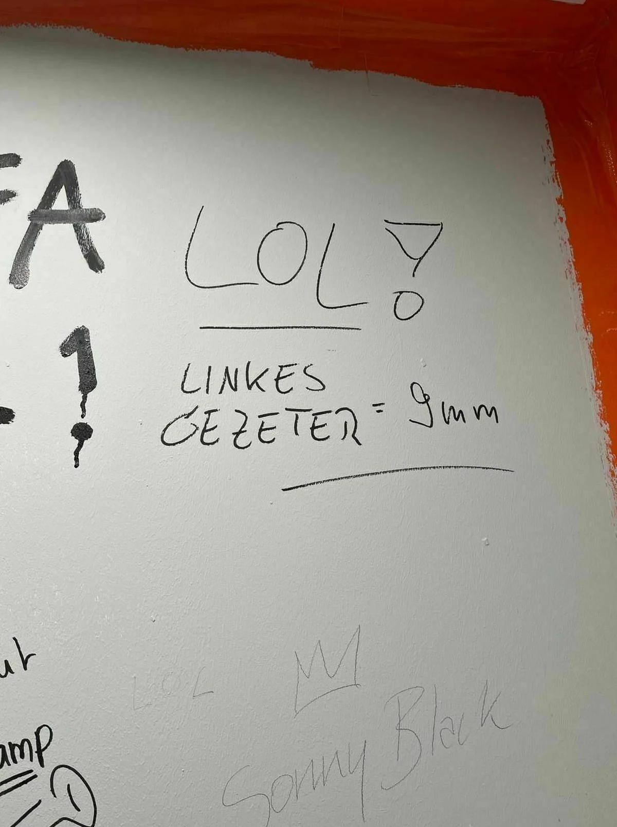 Etwa zur gleichen Zeit klebt auf einer nahe gelegenen Bushaltestelle eine Schwarze Sonne. Das Symbol, ein zwölfarmiges Hakenkreuz, ist seit den 1990er-Jahren Erkennungssymbol der Neonaziszene. Unappetitlich ist auch ein Schriftzug, den die Studierenden im Januar dieses Jahres innerhalb eines Gebäudes der Universität fotografierten. „Linkes Gezeter=Neun Millimeter“ ist auf einer Wand zu lesen. Ein Gewaltaufruf gegen Linke.