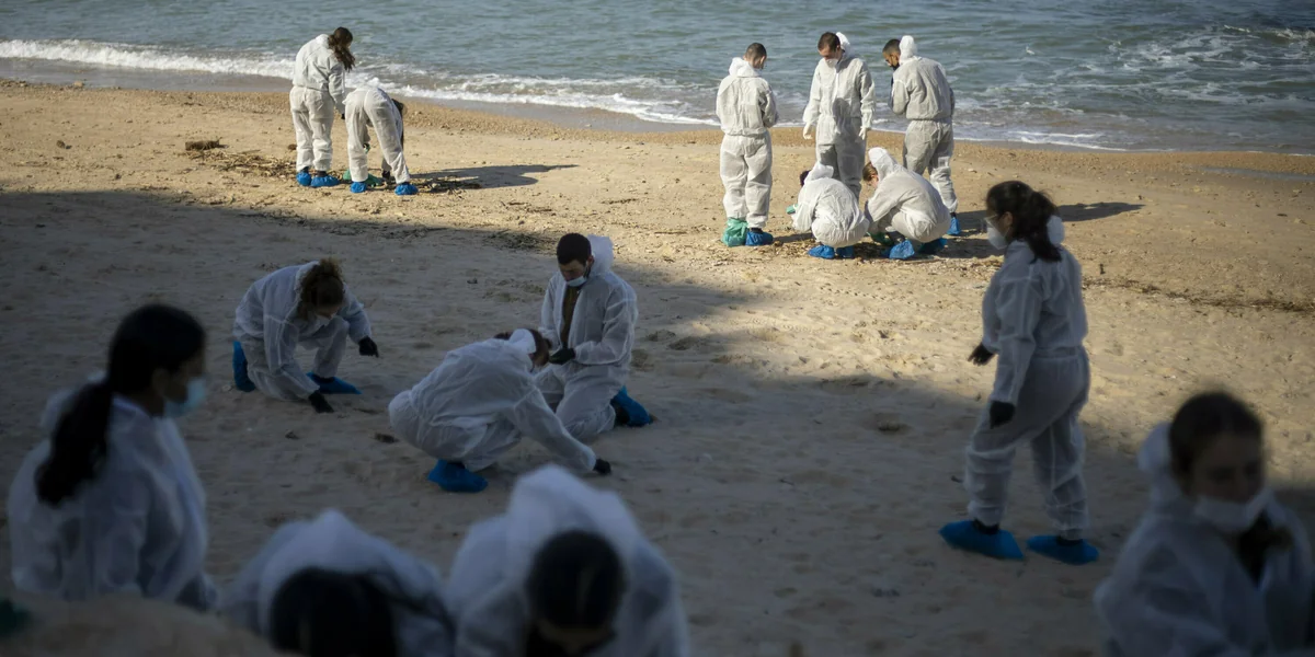 „Ich glaube nicht, dass ich im Sommer mit meinen Kindern an diesen Strand kommen kann.“ Michal Hasson schüttelt den Kopf und hebt einen kleinen schwarzen Klumpen vom Boden auf. Normalerweise geht sie hier am Strand von Palmachim, eine halbe Stunde südlich von Tel Aviv, baden. Doch heute hockt sie mit einer Mülltüte, einer Maske gegen toxische Gase und Plastikhandschuhen im Sand und sammelt auf, was in den letzten Tagen aus dem Meer angespült wurde: Ölreste.