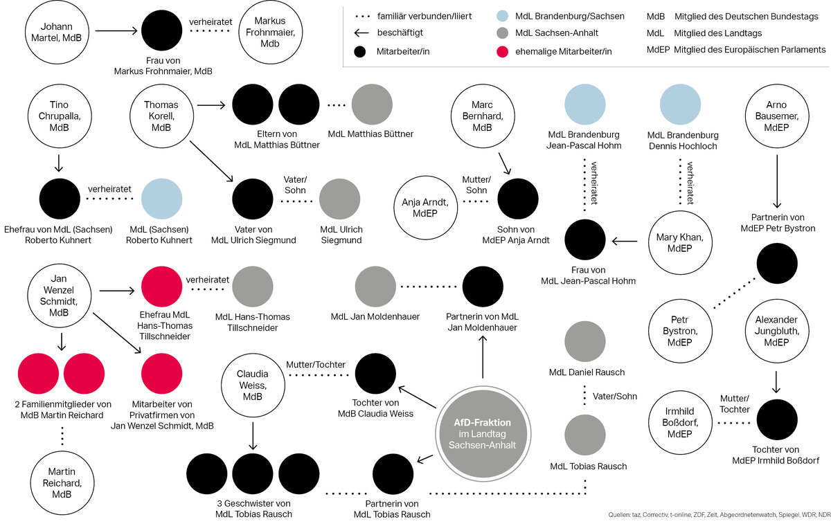 Dabei war Siegmund selbst einst angetreten „gegen eingefahrenen Politikfilz, Mauscheleien und Steuerverschwender“. Gleich drei Geschwister des parlamentarischen Geschäftsführers in Sachsen-Anhalt, Tobias Rausch, arbeiten im Bundestagsbüro der Parteifreundin Claudia Weiss. Deren Tochter wiederum arbeitet für die AfD-Fraktion im Landtag Sachsen-Anhalt, gemeinsam mit Rauschs Partnerin, die dort 6.000 Euro kassieren soll. Kurzum: Es ist kompliziert.