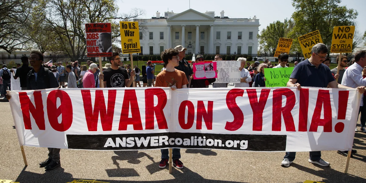 "No War On Syria" steht auf dem Transparent der Demonstranten. Guter Witz.