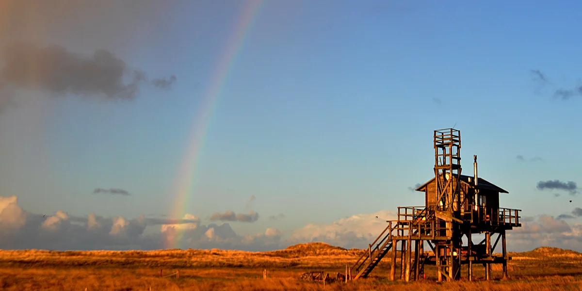 Ein paar Mal hatte ich Land unter. Das war schon ganz beeindruckend. Ich hab mir natürlich vorher die Wasserstandsvorhersage angeschaut und musste entsprechende Vorkehrungen treffen, weil ein paar Sachen unten auf der Salzwiese standen. Die mussten eine Etage höher. Meistens sind Sturmfluten mit starkem Westwind verbunden. Dann tobt westlich der Düne das Meer und nach und nach schiebt sich immer mehr Wasser auf die Insel. Irgendwann ragen nur noch die Hütte und die Dünenkette heraus. Auf der Ostseite ist das Wasser aber fast glatt, weil es durch die Dünen geschützt wird. Land unter war also nicht so spektakulär, wie ich mir das vorgestellt hatte.