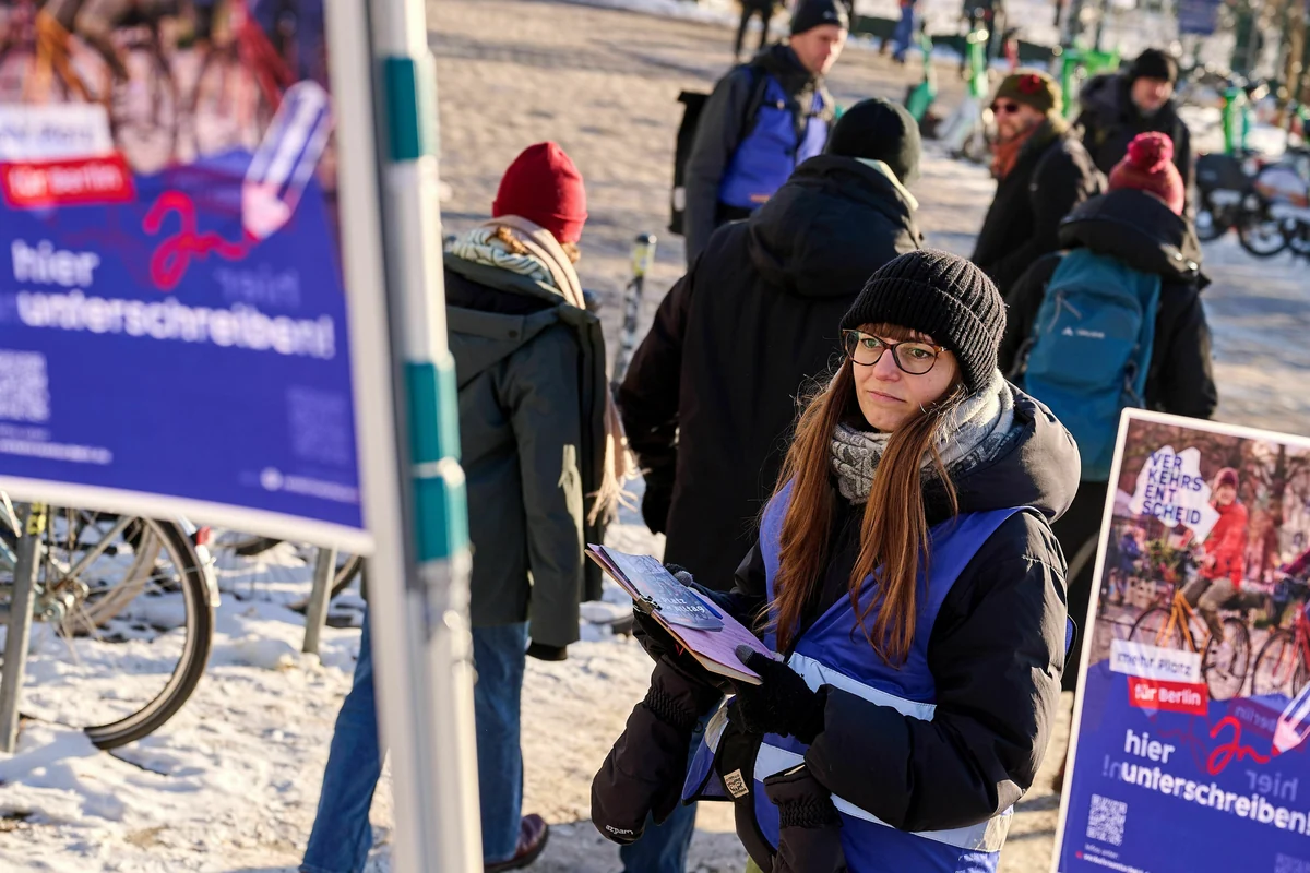 Das Tempelhofer Feld wirkt am Samstagmittag fast wie ein Skigebiet. Viele Familien kommen an diesem Wochenende hierher. Auf Schlitten ziehen Eltern ihren Nachwuchs über das Rollfeld. „Weniger Autos, mehr Berlin!“, schallt es am Rande des früheren Flughafengeländes aus einem Lautsprecher. Am Eingang zum Feld im Neuköllner Schillerkiez haben sich Aktivst:innen der Initiative „Verkehrsentscheid“ mit einem Stand positioniert und sammeln Unterschriften. Das Team wirkt motiviert. Es gibt Kekse und heißen Tee. Für die nächsten Wochen haben sie sich einiges vorgenommen: Rund 175.000 gültige Unterschriften benötigen sie bis Anfang Mai, um einen Volksentscheid zu erwirken.
