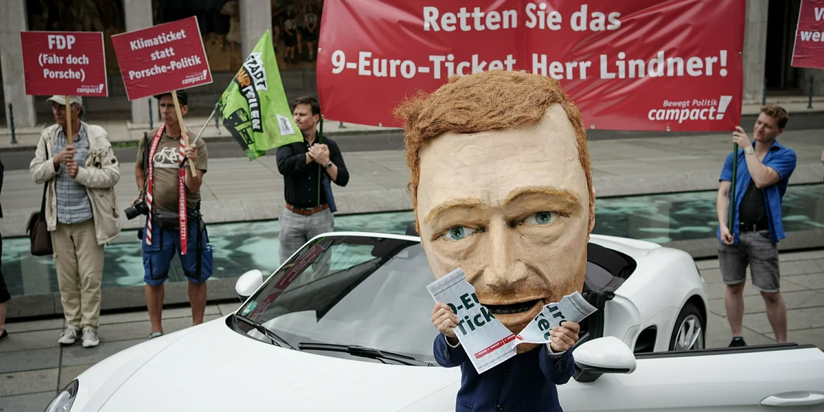 Mit einer Aktion vor dem von FDP-Chef Christian Lindner geführten Bundesfinanzministerium hat die Kampagnen-Organisation Campact am Montag die Forderung nach der Verlängerung des 9-Euro-Tickets bekräftigt. Mitgebracht hatten die Aktivist:innen einen großen Pappkopf mit den Zügen des Finanzministers. Dessen Träger zerriss in einem Porsche-Cabrio 9-Euro-Tickets. Lindner hatte erklärt, für eine Fortführung des Tickets oder eine Anschlusslösung sei kein Geld da.