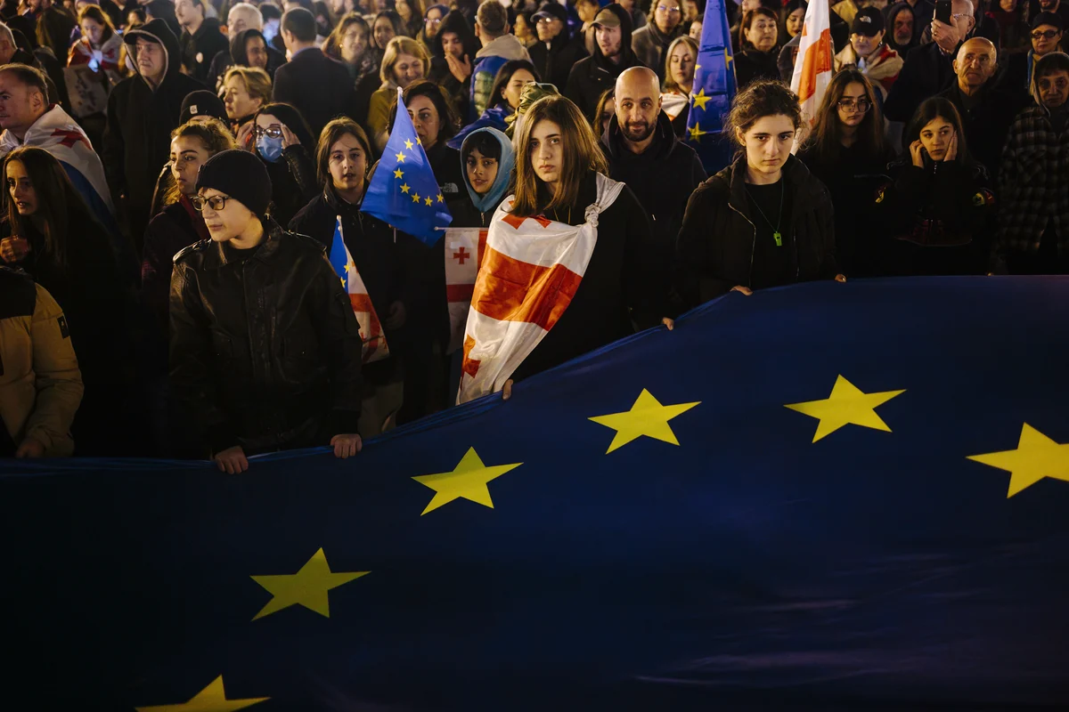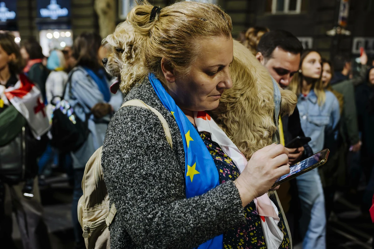 Am Rande des Freiheitsplatzes steht eine Frau mit einem Stirnband aus Wolle, darin stecken ein georgisches und ein EU-Fähnchen. In den Händen hält sie eine Pappe mit der Aufschrift: „Der Georgische Traum ist Russland, Russland ist Krieg.“ Teo Chatiaschwili ist Professorin für Geschichte und Filmtheorie an der Ilia State University in Tbilissi. „Wir wollen zeigen, dass wir ein zivilisiertes europäisches und demokratisches Land sind. Die Regierungspartei Georgischer Traum (KO) hat aber genau die entgegengesetzte Richtung eingeschlagen und die russische Rhetorik übernommen. Wir zweifeln nicht daran, dass die Regierung mit Moskau verbandelt ist“, sagt Chatiaschwili. Bliebe der Georgische Traum an der Macht, werde Georgien allenfalls formal als unabhängiger Staat fortbestehen, wie schon zu Zeiten des russischen Imperiums und der Sowjetunion.