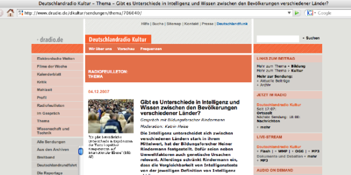 Anfang Dezember war der Magdeburger Bildungsforscher und Entwicklungspsychologe Heiner Rindermann Interviewgast im Deutschlandradio Kultur (DLR). Eigentlich nichts Besonderes, wären da nicht einige bedenkliche Äußerungen Rindermanns zum Thema "Unterschiede in Intelligenz und Wissen zwischen den Bevölkerungen verschiedener Länder" - und eine eher handzahm nachhakende DLR-Moderatorin. Andere Wissenschaftler fahren gegen Rindermann und den Sender jetzt schwere Geschützte auf: "Universitätsdozent verbreitet unwidersprochen rassistische Theorien im Deutschlandradio", heißt es in einer gestern veröffentlichten Pressemitteilung des Instituts für Ethnologie und Afrikastudien der Universität Mainz.