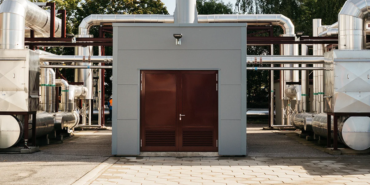 Hier, in der Wellblechhalle, herrscht noch Durcheinander, aber drei schrankgroße, blaue Wärmetauscher sind schon da. Von außen unscheinbare Kästen, bietet ihr Inneres eine bienenwabenförmige Struktur mit Edelstahlleitungen in millimetergenauem Abstand. Hier wird einmal die warme Sole hinein und an 18 Grad Celsius kaltem Wasser vorbeigeführt werden. Dabei wird das kalte Wasser auf 53 Grad Celsius erwärmt. Das ist schon mollig, aber lange nicht genug, um per Fernwärme Wohnungen zu heizen. Darum geht es jetzt weiter, in den zweiten Raum. Der ist der Clou von Schwerin.